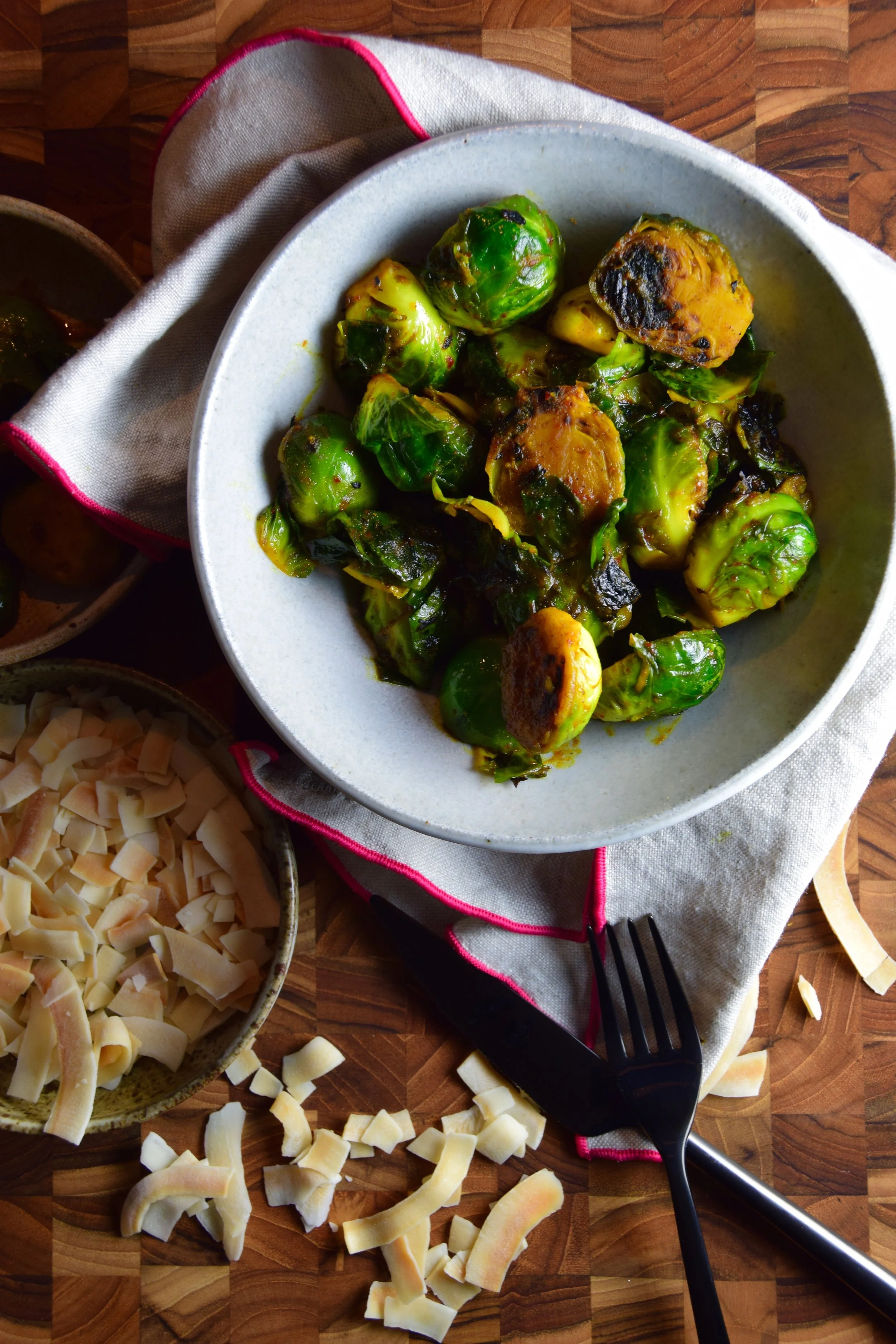 Charred brussel sprouts are coated in a sweet and spicy glaze of turmeric, honey, dried red chili peppers, and stock, then coated in a thick layer of toasted and coarsley ground coconut flakes at the last second.