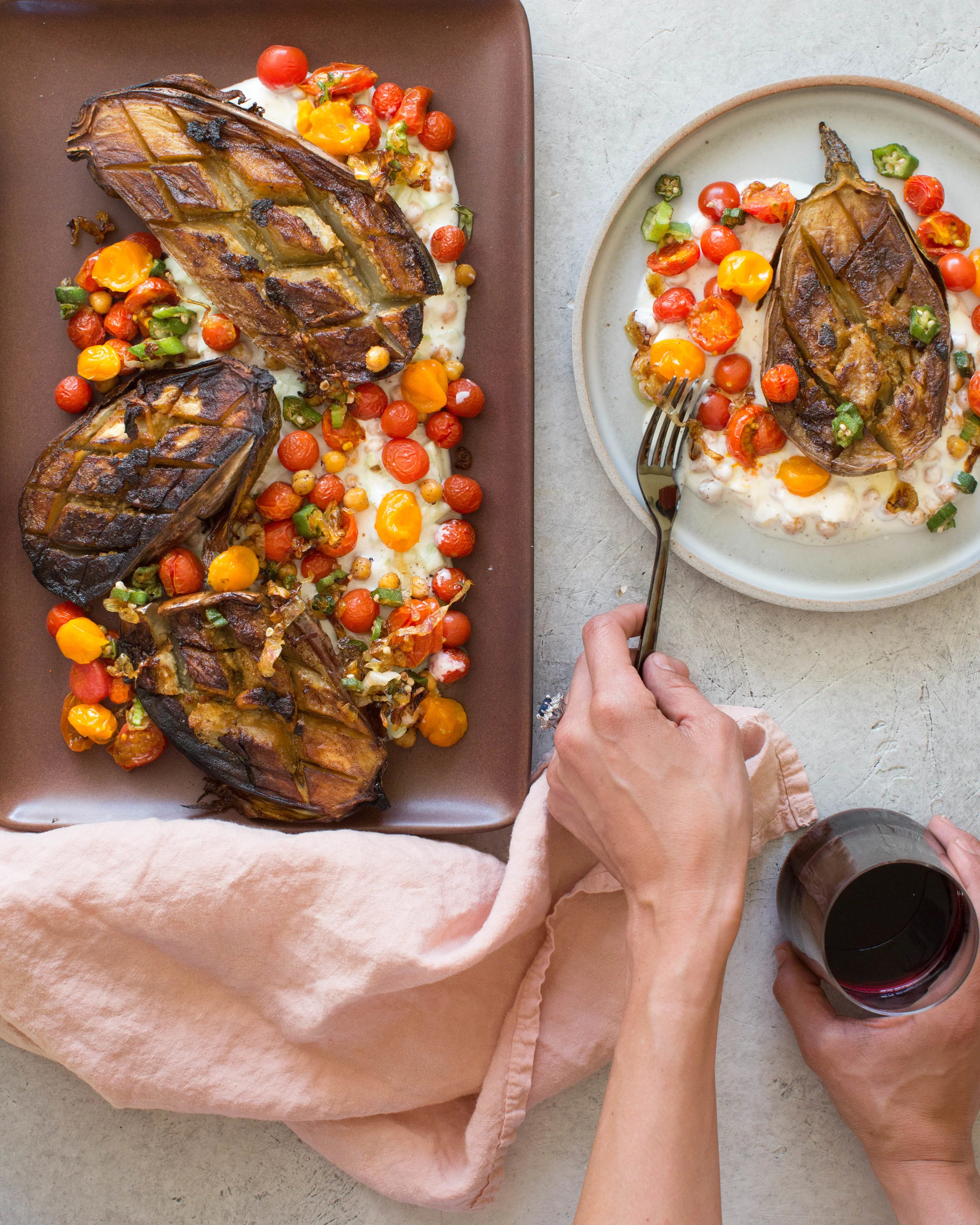 Below, you'll find seared and roasted eggplant with cumin, coriander, paprika, ginger, and garlic, topped with cherry tomatoes three ways, crisped okra and shallots, over a garlic-chickpea-cucumber yogurt sauce. This dish takes about 3 hours to prepare, all in all, but most of that is hands off. A great option for a weekend meatless dinner party, as it is hearty & filling and can certainly star as a main course.